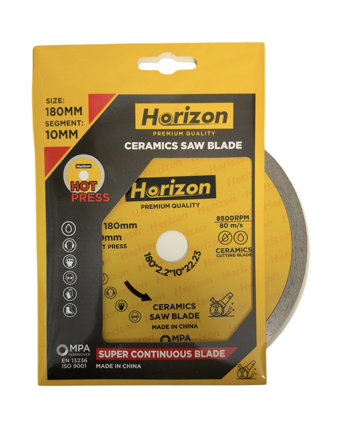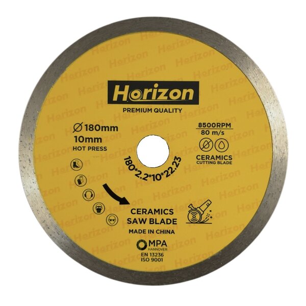 سرامیکبر ۱۸۰میلیمتر برند هوریزون یاز سری تیغه های الماسه مخصوص برش مواد سخت و شکننده مانند کاشی٬سرامیک٬پرسلان و سنگ های نرم است.این تیغه با قطر ۱۸۰ میلیمتر و طراحی بدون دندانه (continuous rim) ٬ برشی کاملا صاف ٬دقیق و بدون لب پریدگی ایجاد میکند.