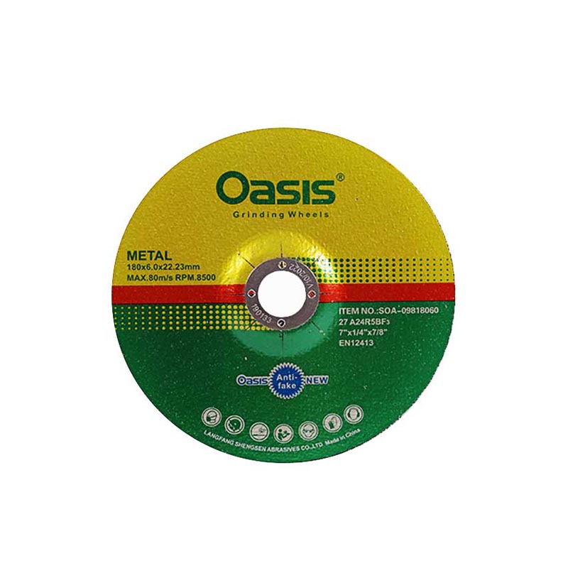 صفحه سنگ ساب بزرگ اوسیس(oasis)180*6*22.23 یکی از ابزارآلات برش و سایش می باشد. این محصول که ساخت کشور چین و شرکت اوسیس می باشد از کیفیت نسبتا بالایی برخوردار است. ضخامت این صفحه سنگ ساب بزرگ با صفحه برش آهن اوسیس متفاوت می باشد.